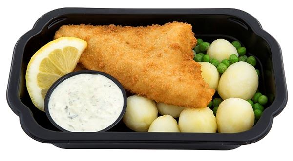 Ingredienser: Potatis, spätta (25%) [(FISK) (Lepidopsetta polyxystra), panering (VETEMJÖL, vatten, salt, potatisstärkelse, socker, jäst, rapsolja], majonnäs [rapsolja, vatten, ÄGGULA, socker, salt, ättika, SENAPSFRÖ, maltodextrin, arom], ÄRTOR, citron, gurkmix [gurka, socker, lök, ättika, paprika, modifierad stärkelse, salt, SENAPSFRÖ, kryddextrakt (cayennepeppar), kryddor], vatten, dressingmix [socker, salt, lök, maltodextrin, modifierad stärkelse, SENAP, solrosolja, smakförstärkare: (E 621), vitlök, gräslök, kryddor, persilja], senap [vatten, SENAPSFRÖ brännvinsättika, salt, antioxidantmedel KALIUMDISULFIT (E224)]], vitpeppar. Förpackad i modifierad atmosfär.